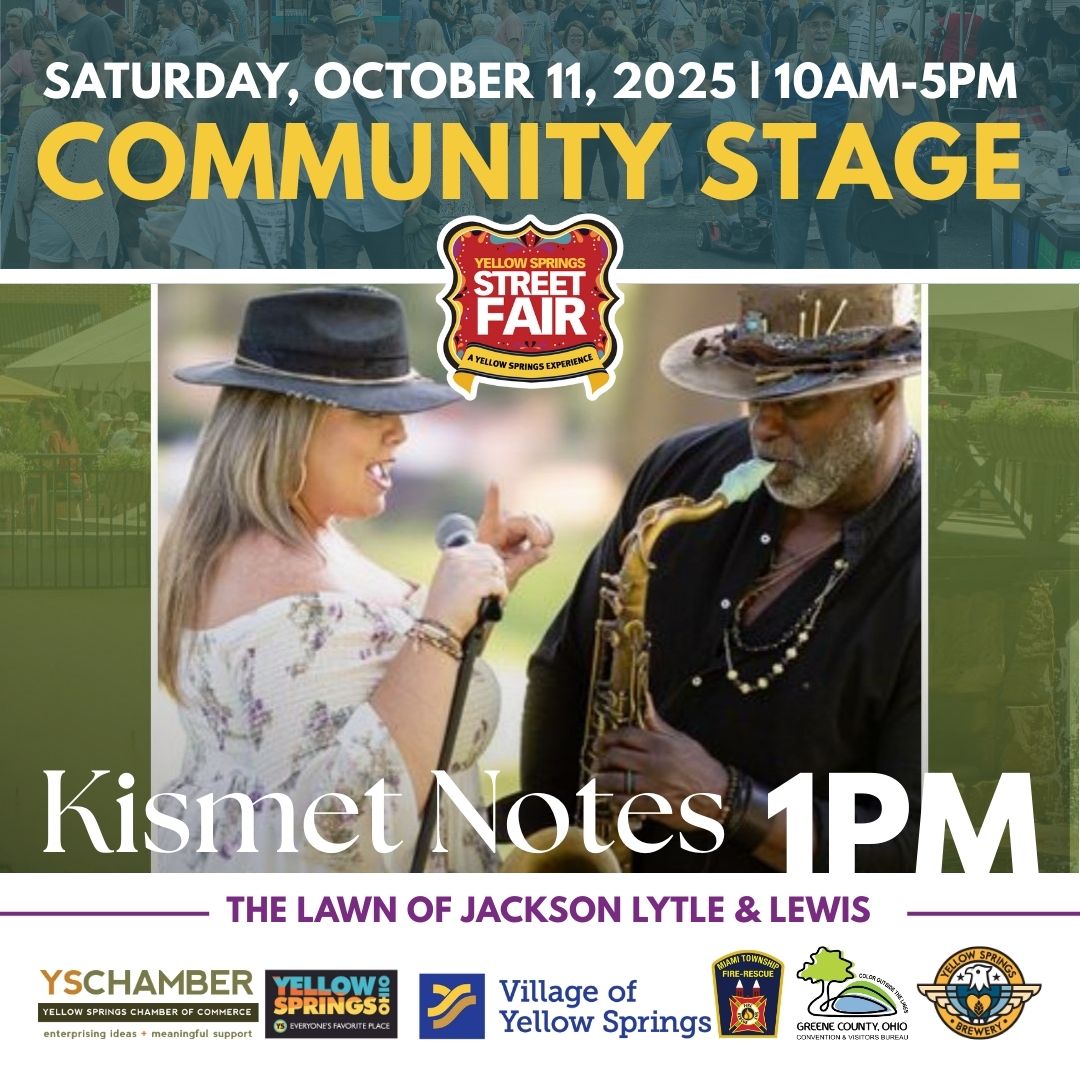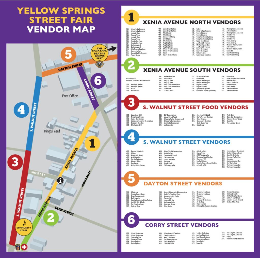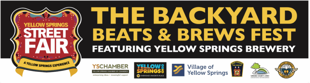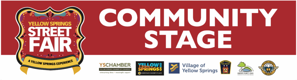 Catch amazing entertainment all day long at the Yellow Springs Street Fair! Look for the gold circles on the map to find The Community Stage and The Backyard Beats+Brews Fest featuring Yellow Springs Brewery. For showtimes and details, scroll this page. There’s more information and excitement ahead.
