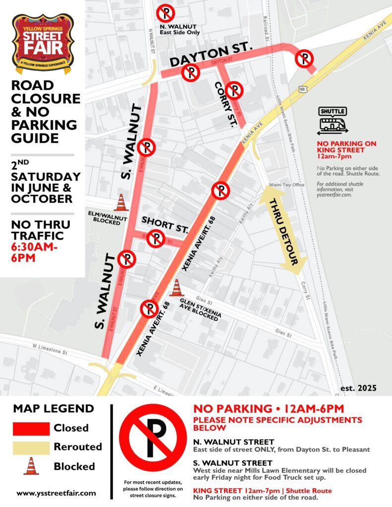 With over 25,000 visitors expected, road closures are essential to ensure safety during the Yellow Springs Street Fair. Route 68/Xenia Avenue, a main route through the village, will be closed to vehicle traffic in the downtown core. Detours will be clearly marked, but vehicle access to the heart of Yellow Springs will not be possible during the event. Whether you’re a resident, vendor, attendee, or simply passing through, please plan ahead and allow extra time for travel.