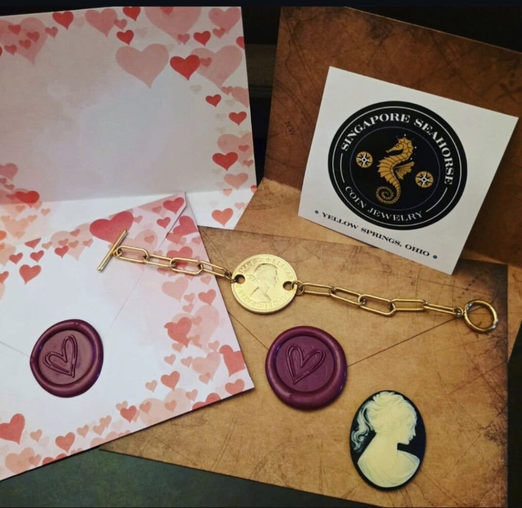 Write a letter to the one you love! Stop by to select the perfect gift, and pick out an “Old World Charm” letter writing set which includes an envelope, matching letter sheet & a handmade wax seal heart sticker at Singapore Seahorse Coin Jewelry.